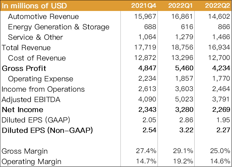 1. Tesla 2022Q2(以下簡稱 Q2)營收為 169 億美元(以下同),QoQ-9.7%、YoY+42%;毛利率 25.0%,QoQ-4.1ppts(但與其他車廠 Q1 18-21% 之毛利率相比仍高,且預期其他車廠 Q2 毛利率也將下滑)。