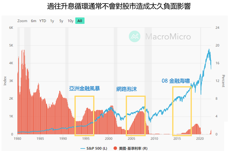 不過攤開歷史,升息循環往往對股市的影響是相對短暫的。換個角度想,通膨高漲其實是整體經濟的需求回溫(當然近期還有受到戰爭影響),因此長期來看,升息某種程度是對未來經濟的看好。