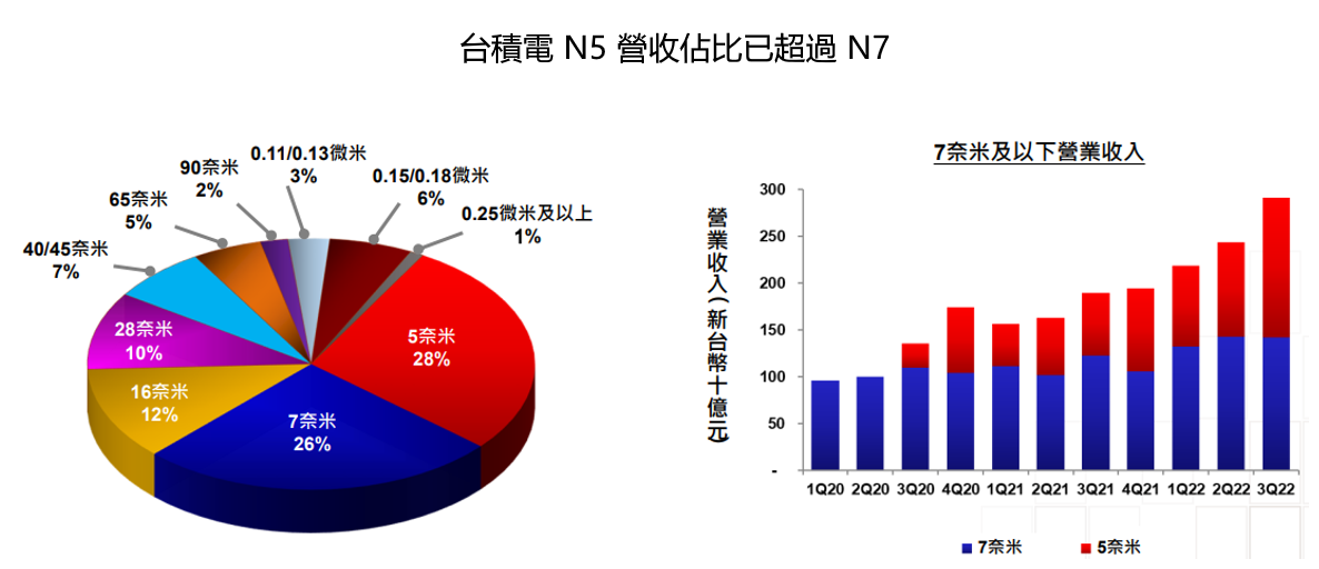 N5 佔比上升因 iPhone14 開始出貨,且採用 N4 的 iPhone14 Pro 熱賣、Nvidia 將 RTX 40 系列顯卡以及高通 S8 Gen1+ 由三星轉單到台積電 N4 製程。