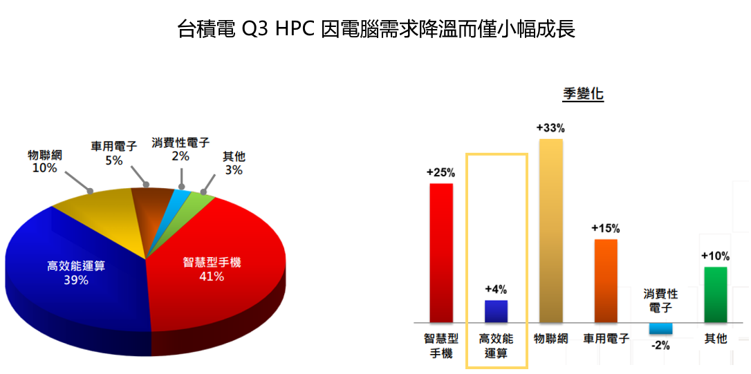 以應用別來看,2022Q3 智慧型手機 41%、HPC 38%、IoT 10%、車用電子 5%、消費性電子 2%。