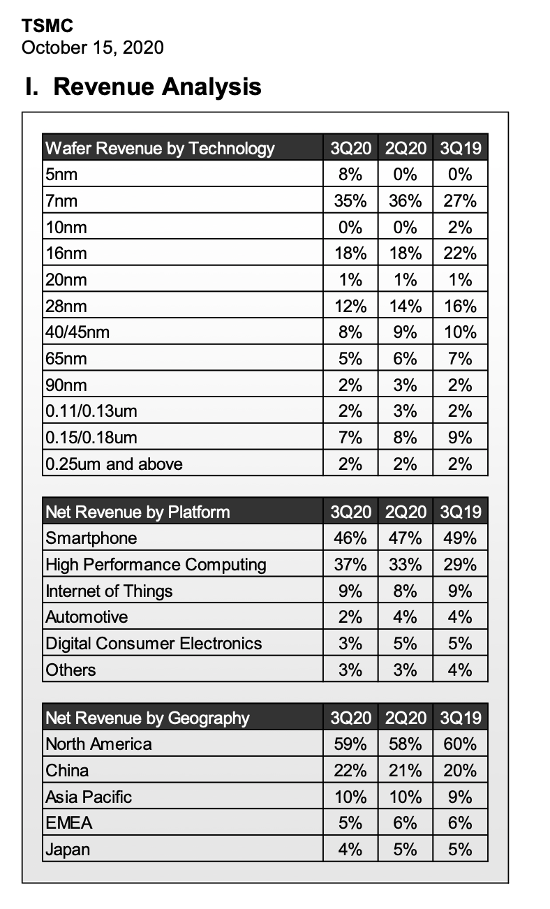 2. 以製程來看,2020Q3 的 5nm 貢獻達 8%,7 nm 35%,16nm 18%。16 nm 以下先進製程的營運佔比已達 61%,並可望持續上升。而先進製程佔比提高也可望拉升台積電的 ASP。