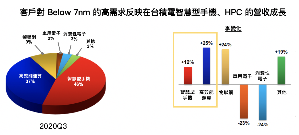 3. 以應用別來看,2020Q3 智慧型手機貢獻 46%,HPC 37%,IoT 9%,整體營運佔比和 2019Q2 相差不大。主要是 5G 智慧型手機、HPC 及 IoT 的高需求帶動了營收成長。而台積電也預期智慧型手機、HPC 將持續維持成長到 2022 年(其中 HPC 成長幅度將高於台積電整體成長平均)。