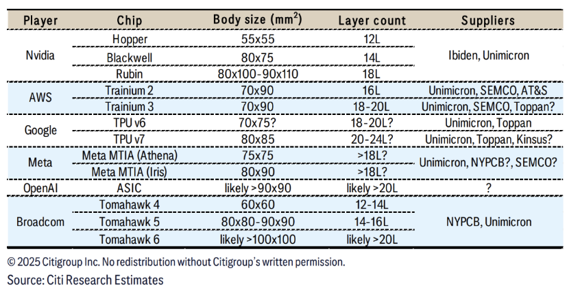從下表可以看到幾大 AI 晶片科技巨頭即將推出的晶片,尺寸大多較上代成長 20%~30% ,層數至少提升至 18~24 層。可見得未來晶片的發展,複雜度持續提升,對載板的用量亦不斷地在增加。