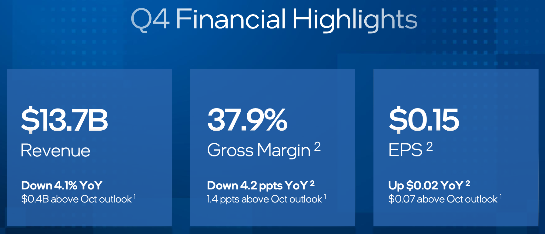 Intel FY2025Q4 總營收達 137 億美元(以下同),YoY-4%,但高於市場預期的 134 億美元。Non-GAAP EPS 為 0.15 元,顯著優於預期的 0.08 元。