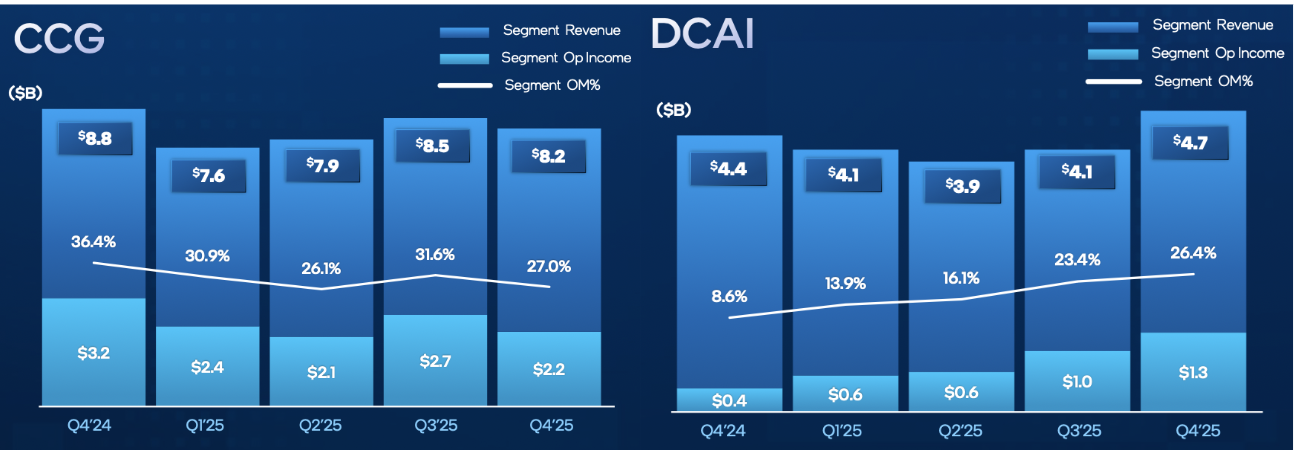 • 資料中心與 AI(DCAI): Q4 營收 47 億美元,YoY+9%,QoQ+15%,成長動能強勁。傳統伺服器 CPU 需求回溫,加上 AI 基礎設施建設帶動的 x86 運算需求,使該部門表現亮眼。