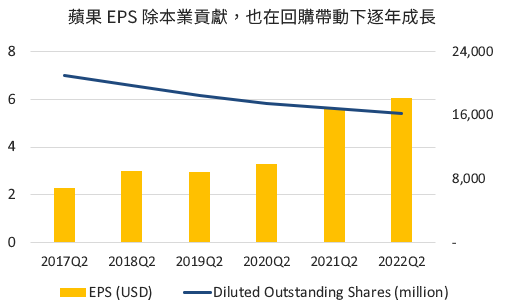 再舉美股的回購王蘋果的例子來看,蘋果過去五年(2017Q2~2022Q2)的累計回購金額達到 3,670 億元美金,而流通在外稀釋後股數則由 209 億股減少至 163 億股,共縮減約 22%,這意味隨著總股數變少,原本在 2017 年只有 10% 蘋果股權的投資者什麼都不用做,在 2022 年就增加至 12.8%。