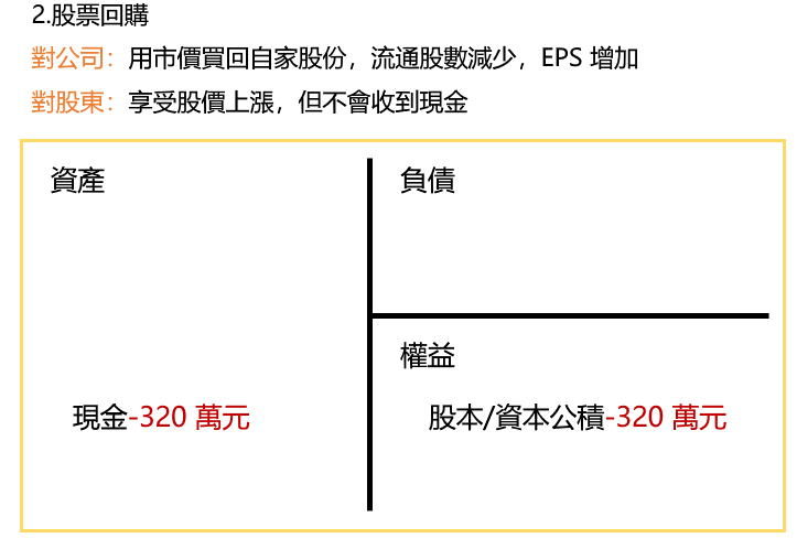 對資產負債表的影響,則是現金減少 320 萬元,而股本/資本公積也同步減少 320 萬元(通常股票買回後會註銷)。