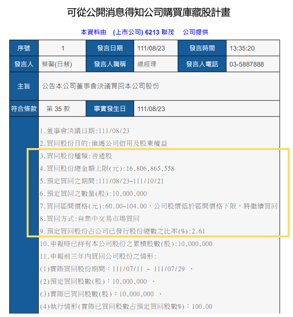 這種方法在台灣則稱為庫藏股,投資人可以透過富果的重大訊息卡片查看公司是否有回購計畫、預定的回購價格、預計購回股數,以及回購執行的比例,作為投資的評估參考。
