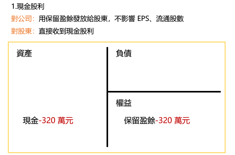 公司宣布今年每股發放 3.2 元,總計 320 萬元的現金股利,那麼表上的資產、保留盈餘會各減少 320 萬元以符合會計恆等式(複習一下,資產 = 負債 + 權益),其他像 EPS、流通股數則不會改變。而股東們則收到合計 320 萬元的現金股利。