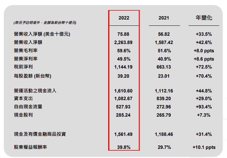 2022 全年來看,營收 758.8 億美元,YoY+33.5%;毛利率 59.6%,YoY+8.0ppts;EPS 39.2 元,YoY+16.19 元,創歷史新高。