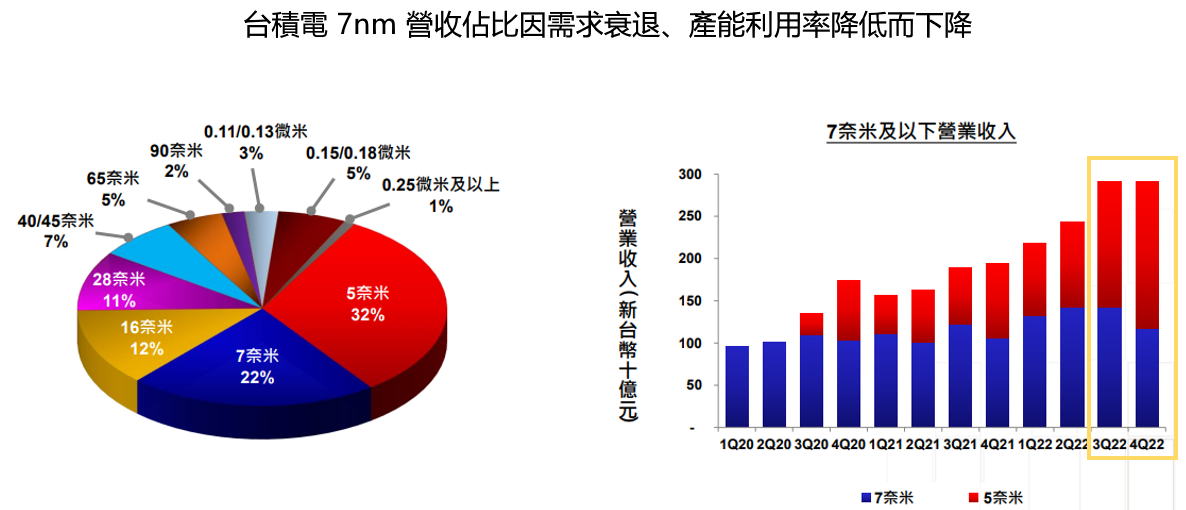 7nm 部分,因主流旗艦晶片多已轉向 5nm 製程,採用 7nm 製程的中高階手機、電腦需求又大幅衰退,也未有新產品發布,使 7nm 需求下降程度超出公司原先預期。