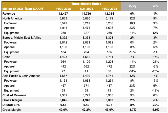 Nike FY2026Q2 總營收達 124 億美元,YoY+1%,略優於預期。其中最大的亮點在於北美市場營收逆勢成長 9%,這主要歸功於公司徹底修正了過去幾年過度激進的 D2C 策略,重新擁抱批發合作夥伴 。